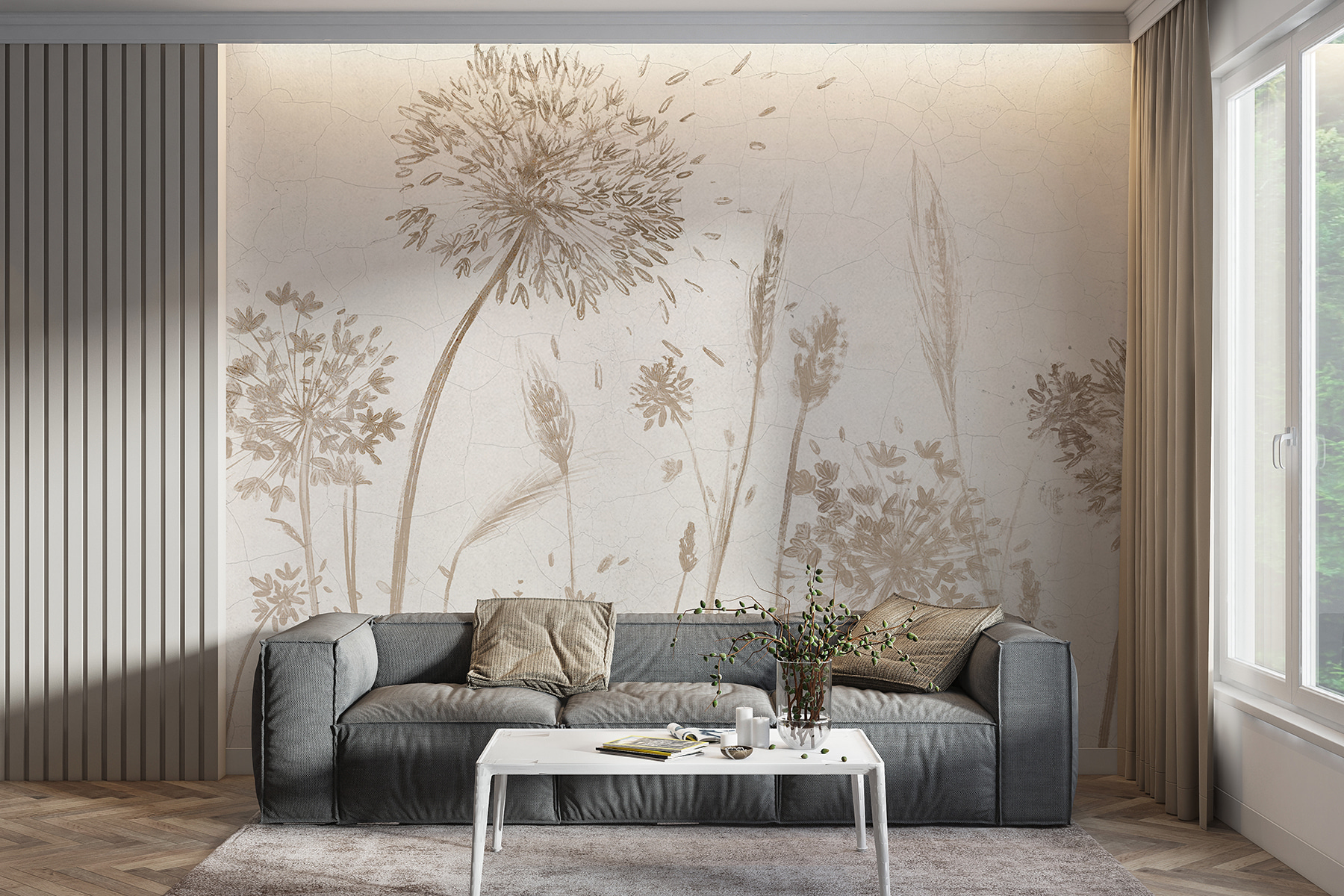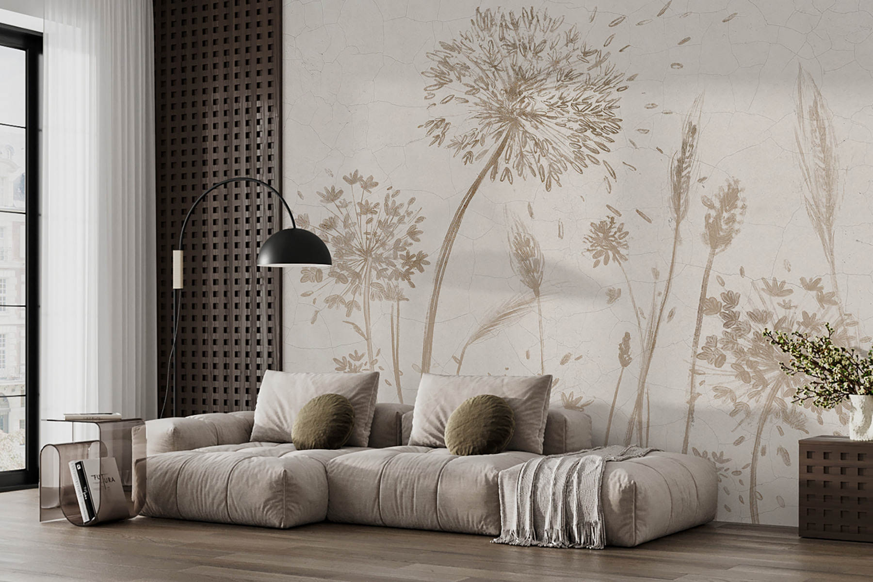 Képzelje el, hogy a természet nyugalmát és szépségét egyenesen a szobájába hozza. Ezt teszi a “Fotótapéta w07921” – olyan, mint egy kis friss levegő a falakon. Képzelje el a finom vadvirágokat és kecses pitypangokat, lágyan megrajzolva, lágy barna és bézs színekben, amelyek úgy ringatóznak, mintha a nyári szellőben ringatóznának. A háttérben lévő repedések rusztikus, vintage bájt kölcsönöznek neki, mintha megcsókolta volna az idő…