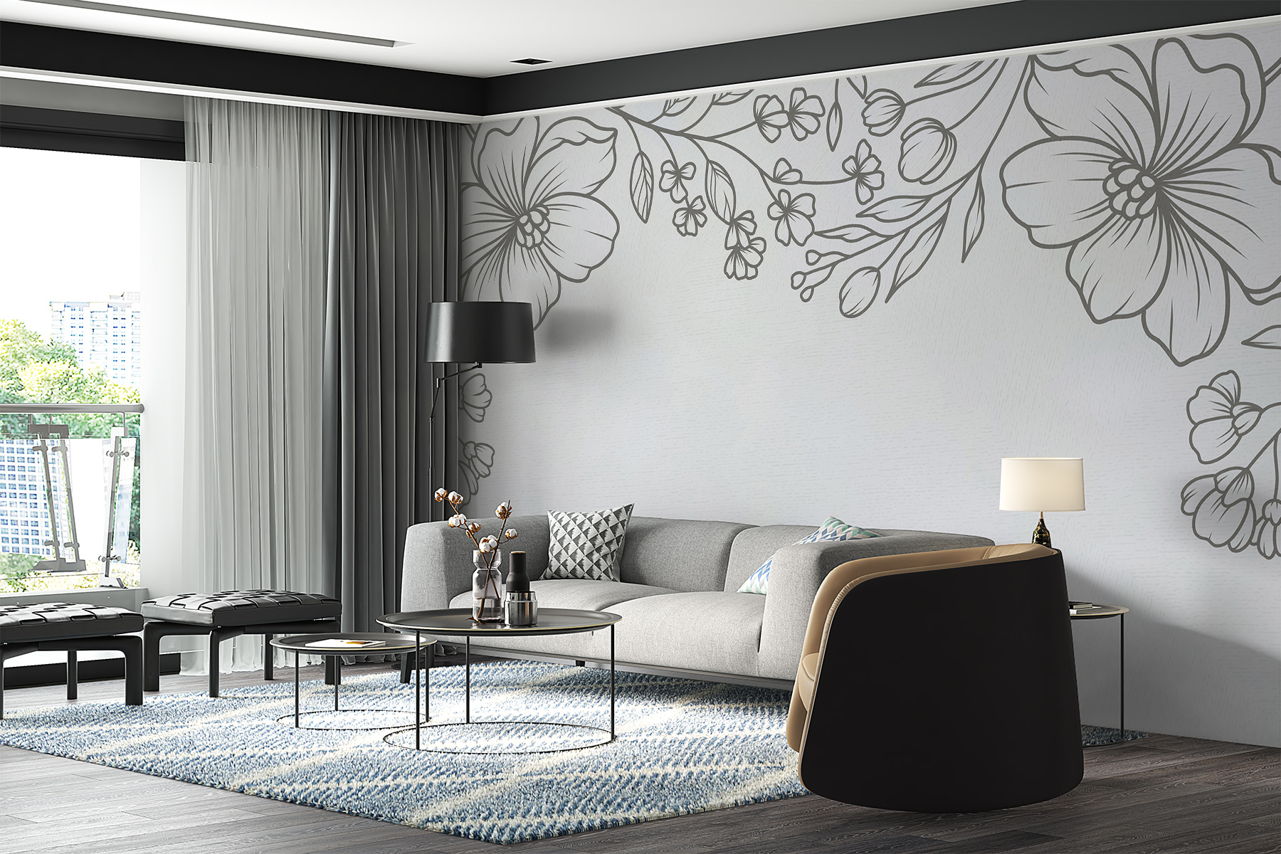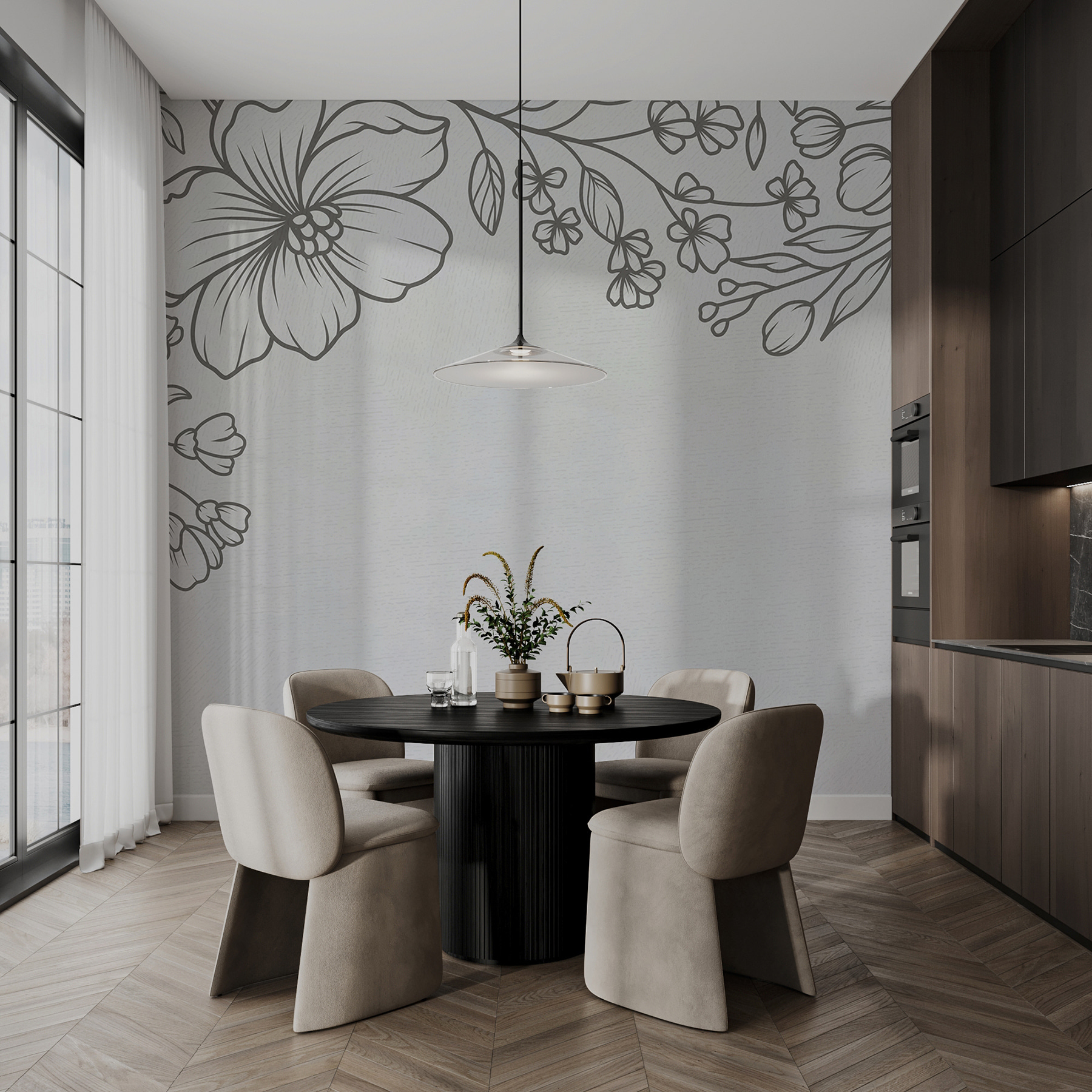 Minden egyes szirom és levél gyönyörűen részletezett, szinte olyan, mintha egy gyengéd firka kelne életre. A semleges tónusok rugalmassá teszik, könnyedén illeszkedik a különböző színekhez és stílusokhoz. Ez az a fajta háttér, amely kikapcsolódásra és kreativitásra hív. Képzelje el egy hangulatos olvasósarokban vagy a nappali nyugodt középpontjaként – biztosan örömet és bókokat vált ki a vendégekből!