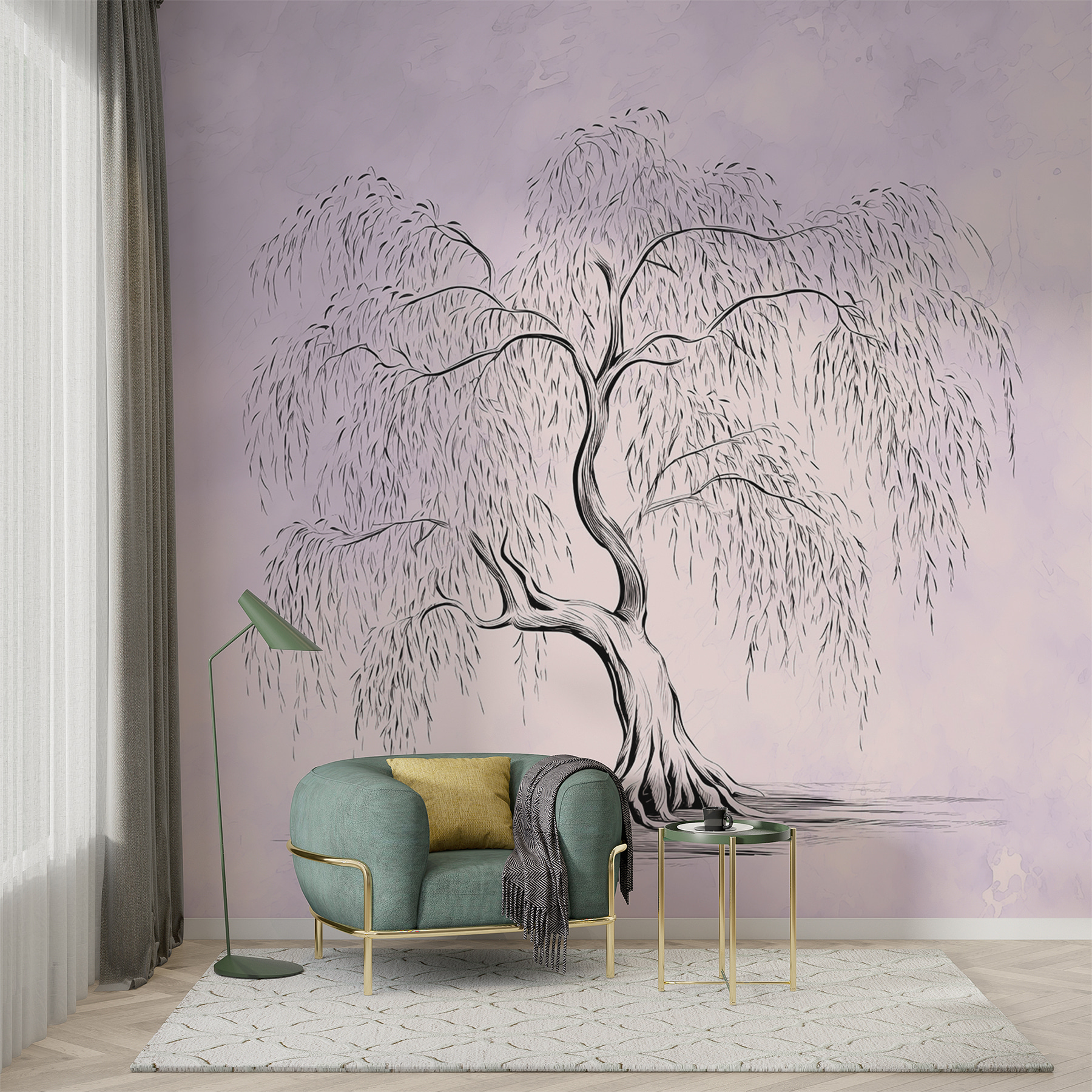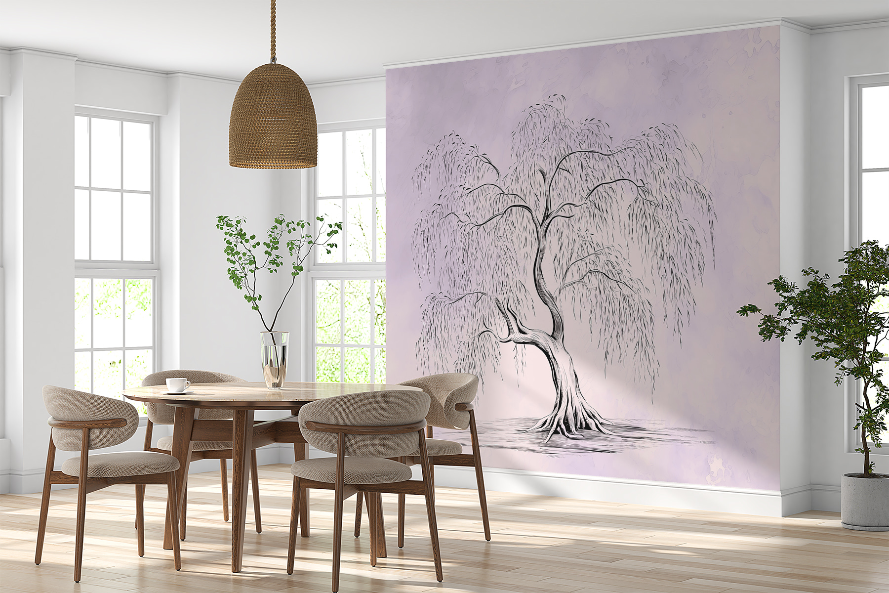 A lágy, mosott háttér a levendula és a krém árnyalataival megadja ezt a derűs, szinte varázslatos hangulatot. Azonnal nyugtató elvonulássá varázsolja a szobát. El tudod képzelni, hogy minden nap erre ébredsz? Vagy esetleg egy hangulatos olvasósarokban, ahol elmerülhetsz egy könyvben, miközben a békés fa társaságot nyújt neked? Van benne valami földhözragadt és megnyugtató.