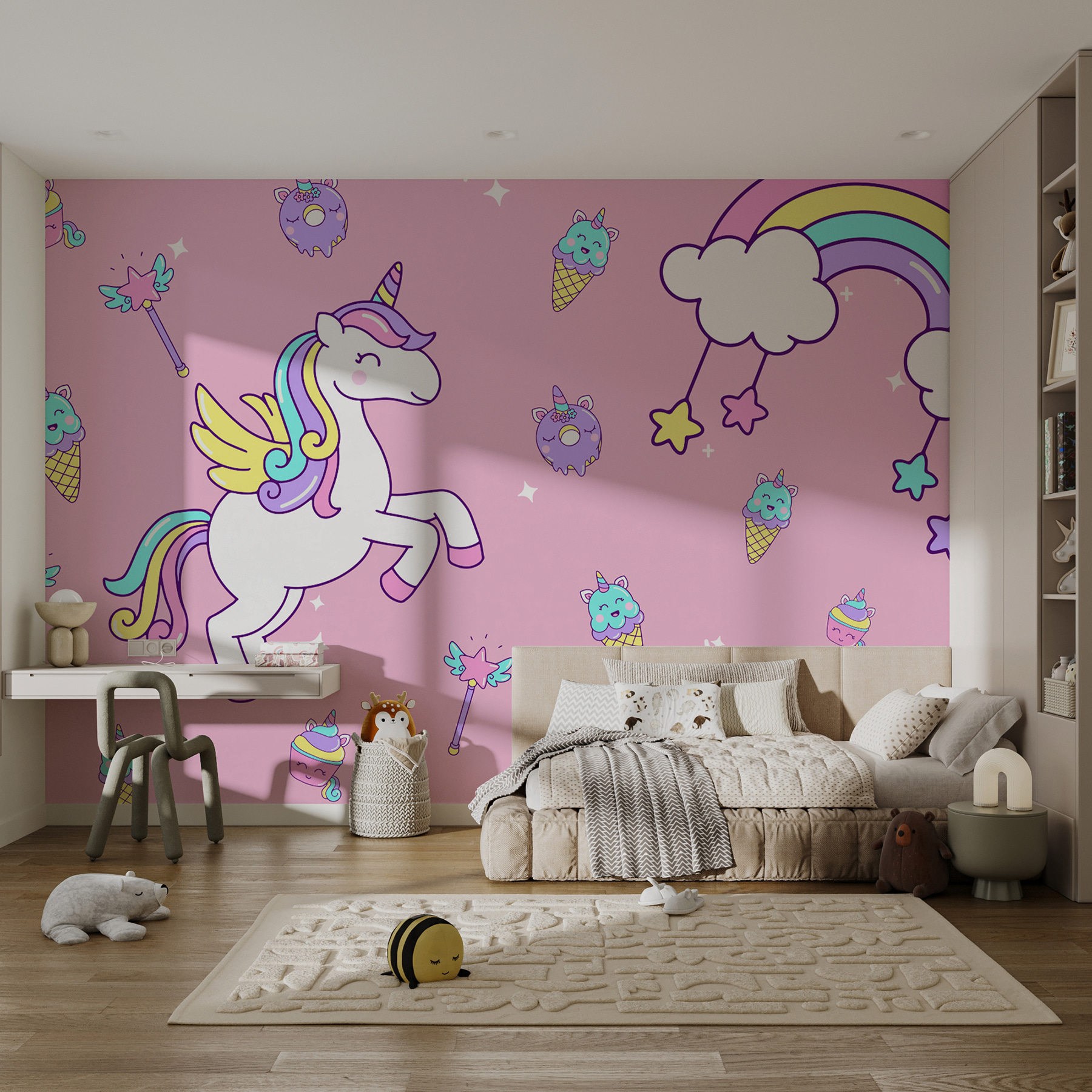 Alakítsa át falát egy szeszélyes csodavilággá ezzel a bájos falfestménnyel, amelyen egyszarvúak és fagylaltok sorakoznak. Képzelj el egy varázslatos egyszarvút, amint élénk színek, mosolygós fagylaltkelyhek és játékos felhők között ágaskodik. Olyan, mint egy édességbolt-robbanás, amely álmodozásra és kacagásra hív. Képzeld el, ahogy a gyerekek (vagy felnőttek!) sütkéreznek ennek a vibráló jelenetnek az örömében, ahol minden pillantás egy kis varázslatot vált ki. Tökéletes játékszobába, gyerekszobába, vagy bárhová, ahol jól jönne egy kis vidámság. Ez az a fajta dekoráció, amely nem csak díszít, hanem mindenkit felvidít – komolyan, ki tudna ellenállni egy egyszarvúnak, amely felfelé tartja a hüvelykujját? Fogadja el a játékos hangulatot, és hagyja, hogy a falak elragadó történetet meséljenek.