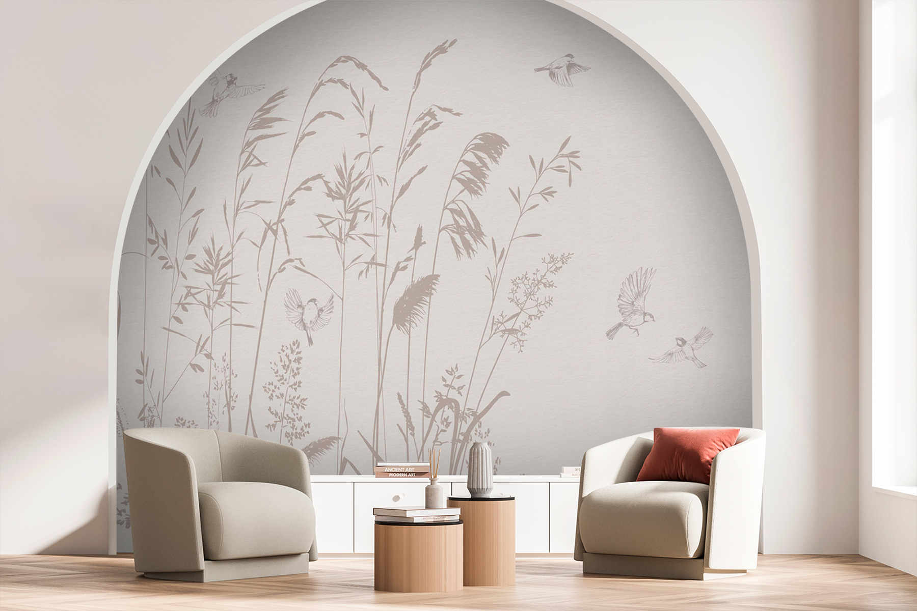 És azok a madarak! Úgy szóródnak szét, mint az öröm kis hangjegyei, életet és mozgást kölcsönözve a falaknak. Ez a falfestmény mindent nyugodtnak és frissnek, mégis finoman vibrálónak érez. Nem követeli a figyelmet – kedvesen hívja azt. Nagyszerű azoknak, akik szeretik a természet érintését anélkül, hogy kilépnének a szabadba.