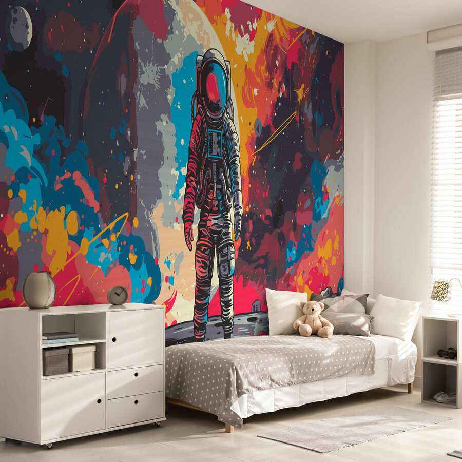 Képzelj el egy űrhajóst, egyenesen a legvadabb űrálmaidból, aki a csillagközi táj robbanásszerű látványa előtt áll. Olyan, mint egy kozmikus táncparti, valahányszor csak ránézel! Tökéletes mindenkinek, aki a csoda és a határtalan lehetőségek elemét szeretné a szobájába varázsolni. Gyerekek, felnőttek – mindenki el fog veszni a varázslatos galaxis hangulatában. Ez az a fajta falfestmény, amely elgondolkodtat, álmodozásra késztet, és talán még egy utazást is tervez a csillagok közé!