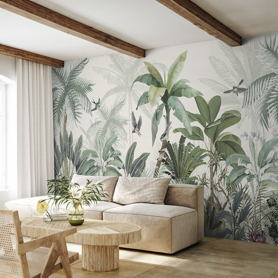 Ezzel a lenyűgöző falfestménnyel bármilyen teret trópusi paradicsommá varázsolhatsz. Olyan, mintha egy darab dzsungel lenne otthonodban, buja zölddel és vidám madarakkal. Képzelje el, ahogy a reggeli kávéját kortyolgatva lágy, trópusi hangulat fogadja – komolyan, lehet ennél jobb módja a nap indításának? Ez a tapéta nem csak a szobát változtatja meg, hanem a természetet is behívja a házba, szellős délutánokról és napfényben fürdő kalandokról suttogva. Tökéletes a nappaliba vagy akár egy hangulatos olvasósarokba, egy kis menekülés közvetlenül a falakon. Minden pillantás olyan érzés, mint egy mini vakáció, közvetlenül az otthon kényelméből.