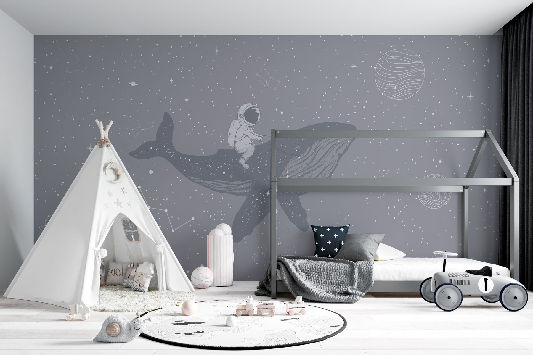 Képzeld el, hogy belépsz egy szobába, és egy űrhajóst találsz, aki lazán lovagol egy bálnán az űrben. Egy falfestmény, egyenesen egy esti meséből! Mintha az univerzum úgy döntött volna, hogy összekeveri a legjobb állatokat és galaxisokat egy szeszélyes utazásra. Tökéletes az álmodozóknak és csillagászoknak, bármelyik falat csillagközi tengeri tájjá varázsolja. Érezd a varázslatot – lebegj a csillagok és bolygók mellett, miközben otthon pihensz. Kinek van szüksége tévére, amikor kozmikus vibrálás és egy óriási, barátságos bálna köszönti Önt? Készen áll a kalandra? Merüljön el!