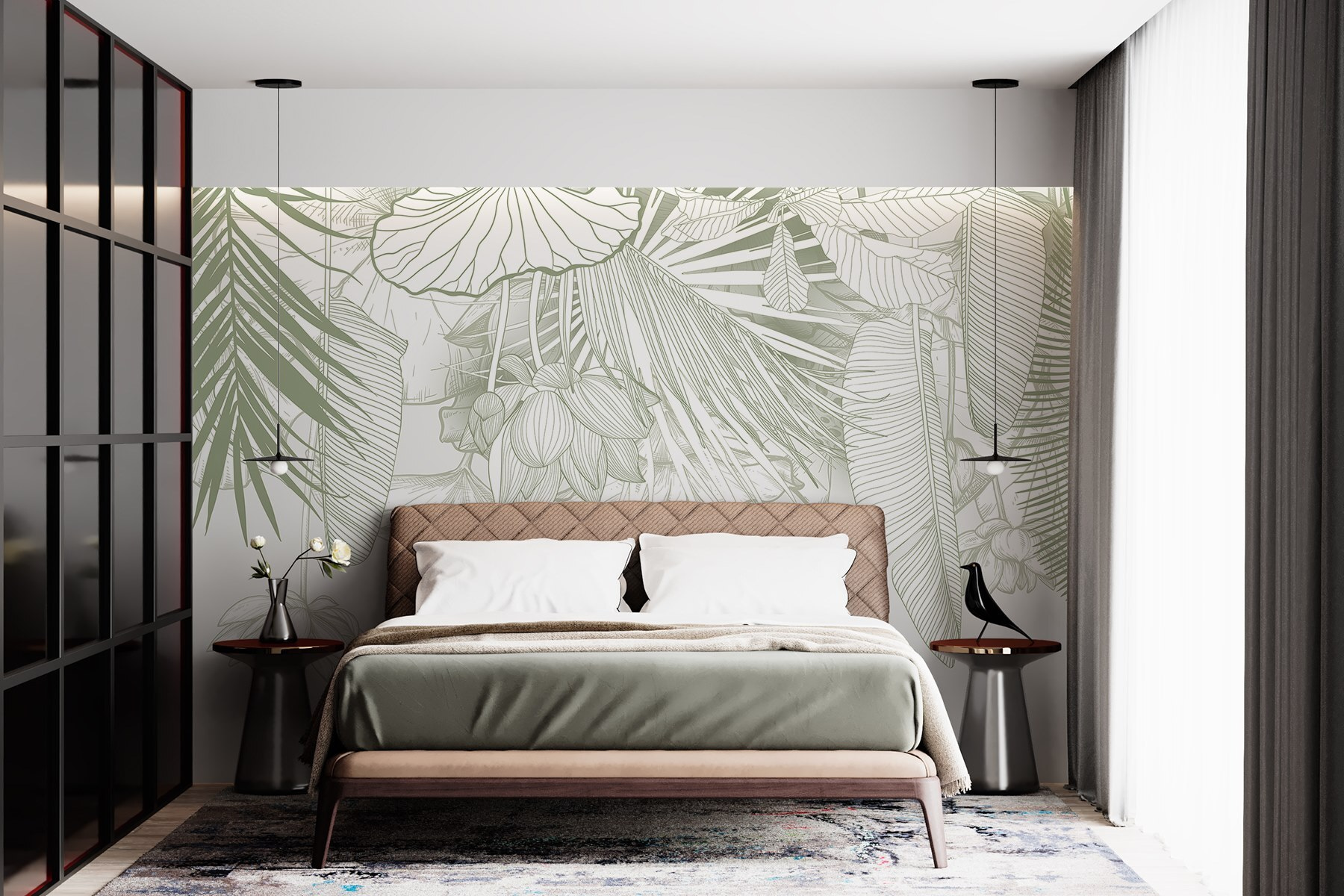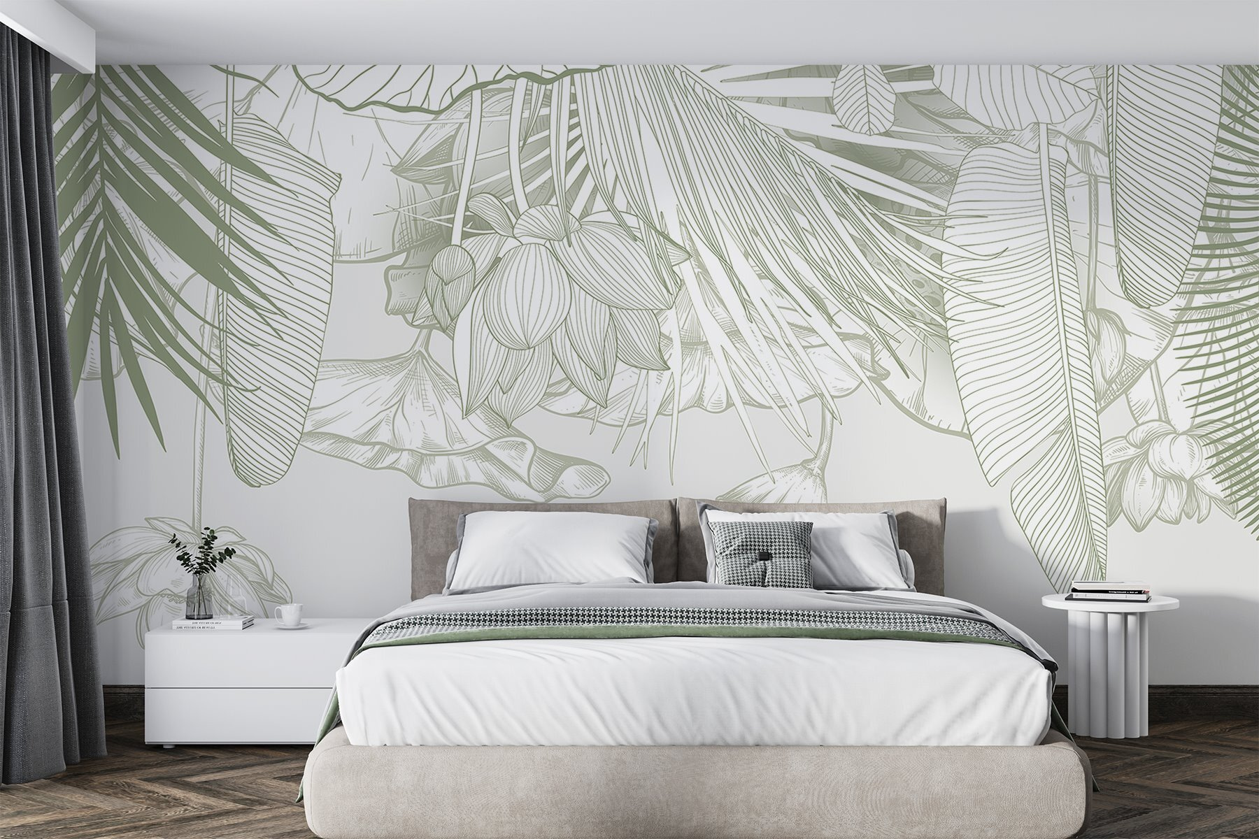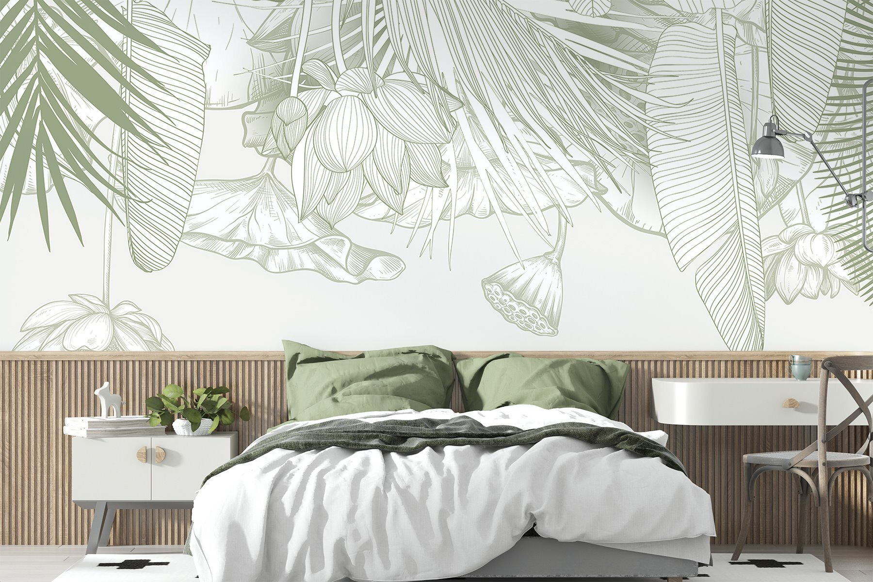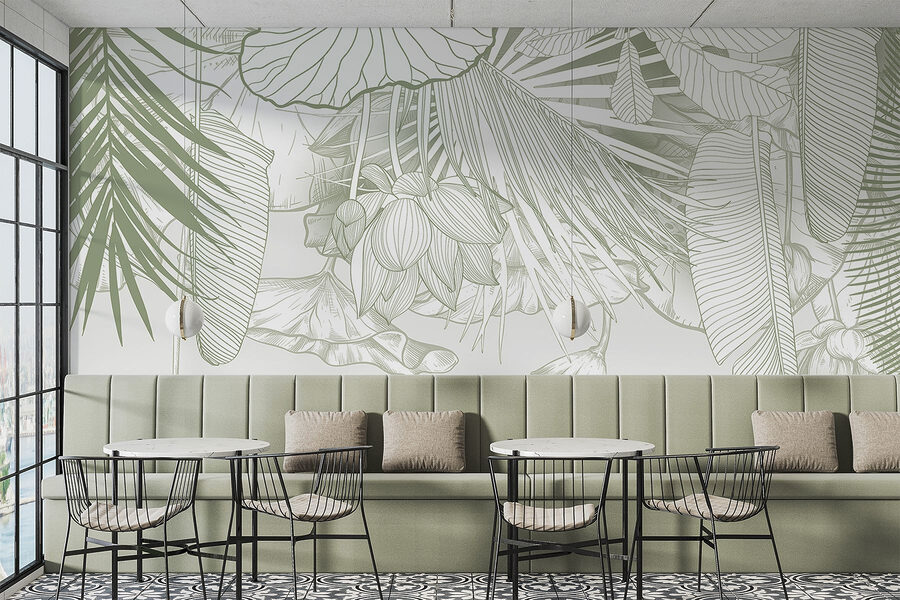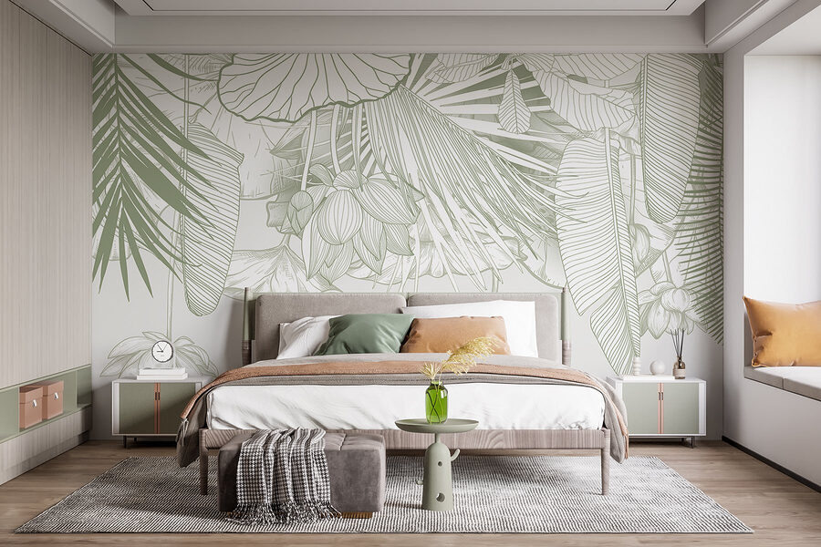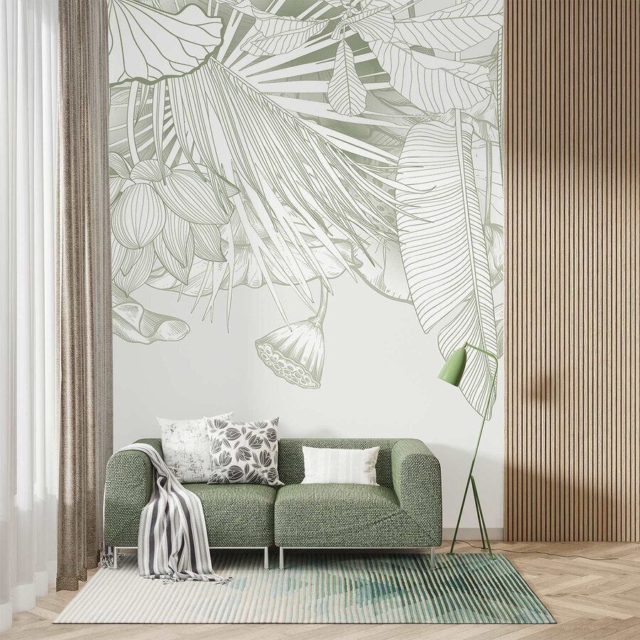 Bármelyik szobát nyugodt oázissá varázsolhatja ezzel a lenyűgöző falfestménnyel, amely lágy tónusú, bonyolult lombozatot ábrázol. Olyan, mintha a trópusok egy darabját hozná be a helyiségébe, a páratartalom nélkül! Képzelje el, ahogy a reggeli kávéját kortyolgatja, miközben finom levelek és virágok veszik körül – ez aztán a hangulatfokozó! Ez a falfestmény tökéletes egy hangulatos olvasósarokba vagy egy élénk étkezőbe, és a természetnek éppen megfelelő hangulatot kölcsönöz. Ráadásul a gyengéd színek nyugodt hangulatot árasztanak, így nyugodtnak és ihletettnek érezheti magát. Ki gondolta volna, hogy a falak ennyire üdítőek lehetnek?