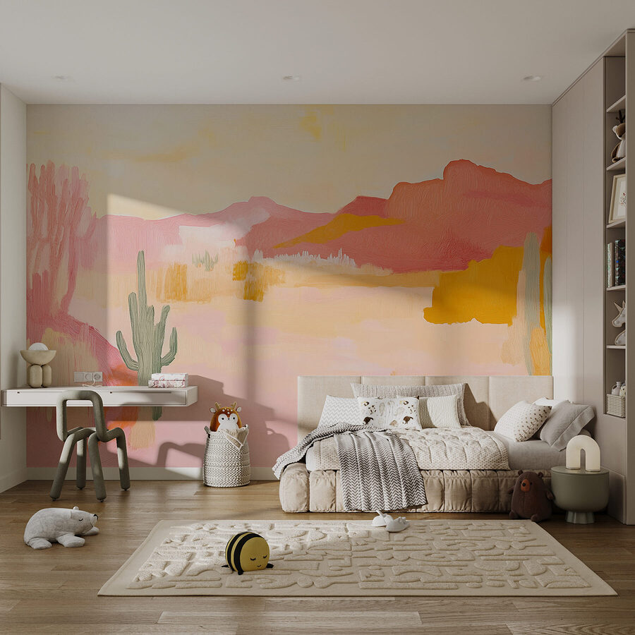 Képzelje el, hogy szobáját egy nyugodt sivatagi oázissá alakítja át ezzel a lenyűgöző falfestménnyel. A rózsaszín és a lágy sárga meleg árnyalataiban fürdőző, álmodozó tájat ábrázoló falfestmény nyugtató hangulatot áraszt, és olyan érzést kelt, mintha egy napsütötte sivatagban sétálnál alkonyatkor. Képzeljen el egy hangulatos zugot, ahol a kávéját kortyolgatva spontán kirándulásokról álmodozik. A játékos kaktuszok és a dombok életet és melegséget hoznak, a természet szépségének vásznává változtatva a falaidat. Olyan, mintha egy ablak lenne a vadonra az otthonában – anélkül, hogy homok kerülne a cipőjébe! Tökéletes mindenkinek, aki egy kis nyugalmat szeretne a terébe.