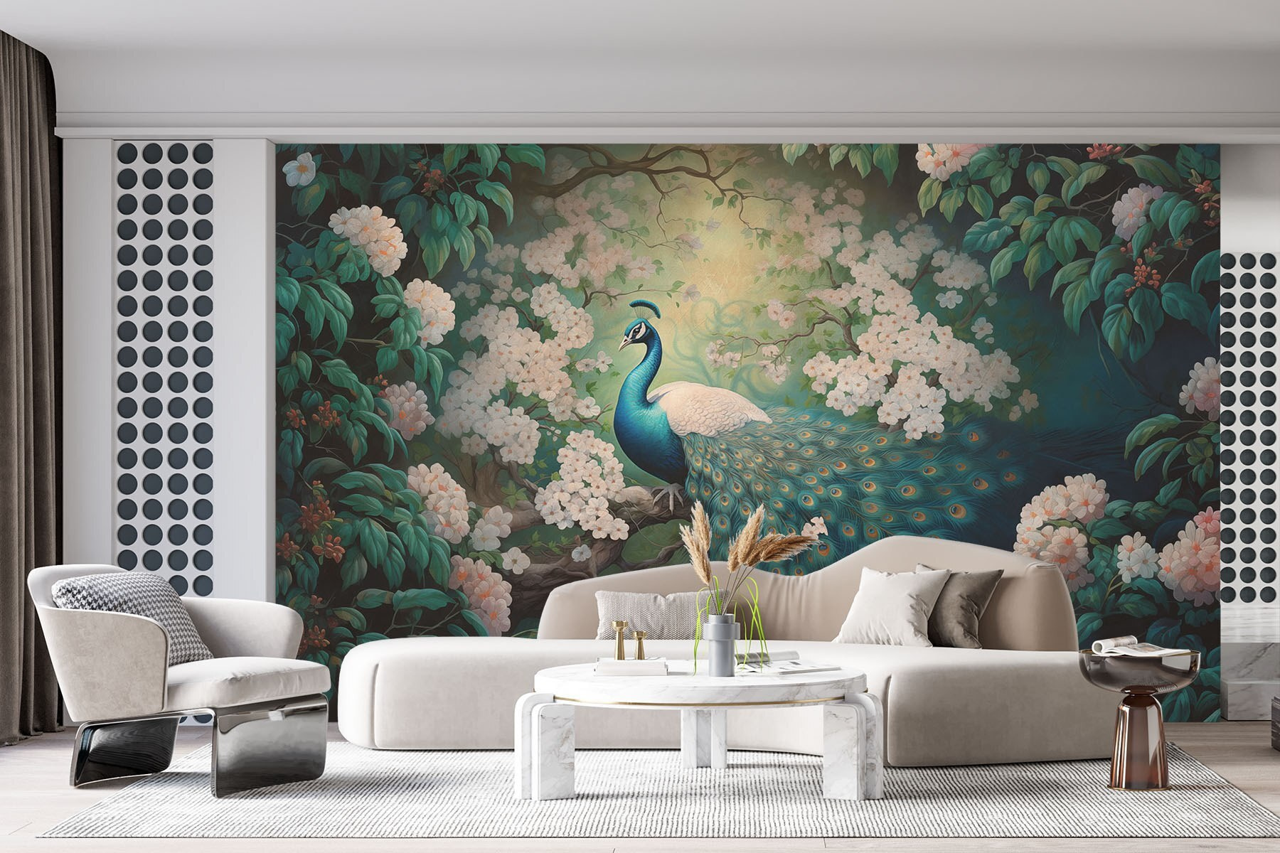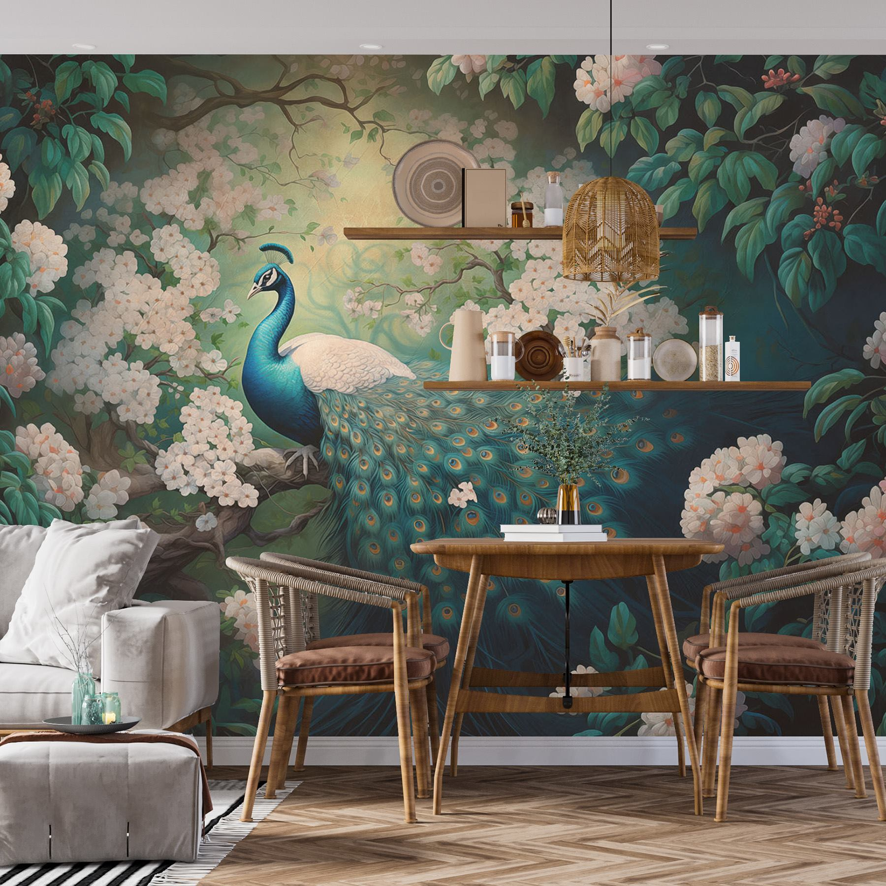 Alakítsa át terét ezzel a lenyűgöző falfestménnyel, amelyen egy páva ül kecsesen egy faágon, finom virágokkal körülvéve. Olyan, mintha a természet egy szeletét hívná meg otthonába! Képzelje el, hogy minden reggel ilyen vibráló színekre ébred – ezek a kékek és zöldek egyszerűen elbűvölőek. Ráadásul talán egy kicsit flancosnak is érzi magát, ha egy ilyen fenséges madár a fali pajtása.
