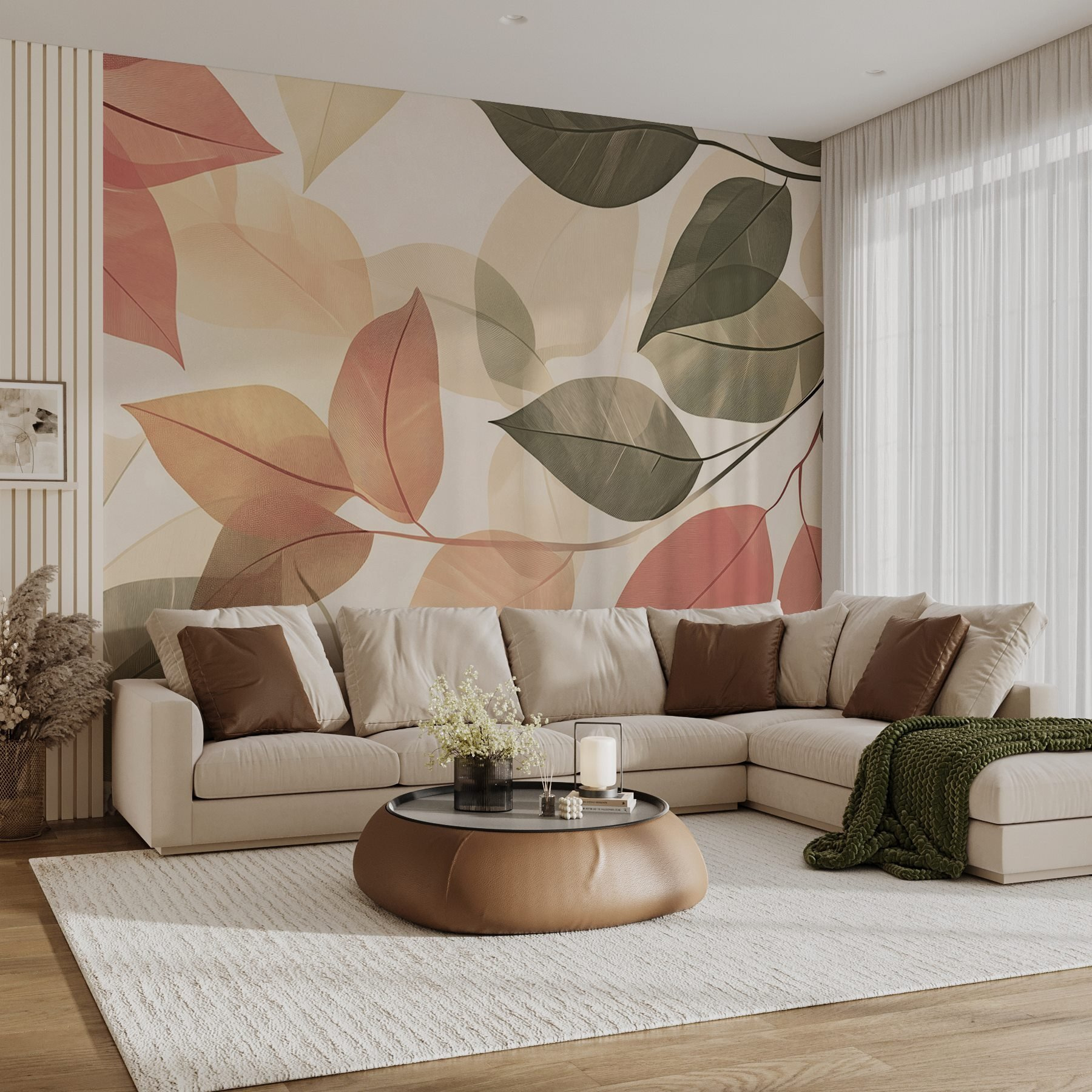 Alakítson át egy unalmas falat egy nyugtató meneküléssé ezzel a “A természet szépségének lágy árnyalatai” című falfestménnyel. Képzeld el: belépsz egy szobába, és bumm! A levelek lágy tánca fogad tompa rózsaszín és zöld színekben, egy erdei séta nyugalmát idézve. Olyan, mintha a természet egy szeletét hoznánk be a házba, a bosszantó bogarak nélkül. Érezze, ahogy a stressz elolvad, ahogy ezek a lágy árnyalatok körülölelik, és meghitt, hívogató légkört teremtenek. Tökéletes egy olvasósarokba vagy egy nyugodt hálószobába, ez a falfestmény nem csak díszít – segít egy kicsit könnyebben lélegezni. Képzelje el, ahogy egy csésze teával összegömbölyödik, a természet gyengéd érintése által körülvéve. Ki gondolta volna, hogy a falak ennyire élettel telinek tűnhetnek?
