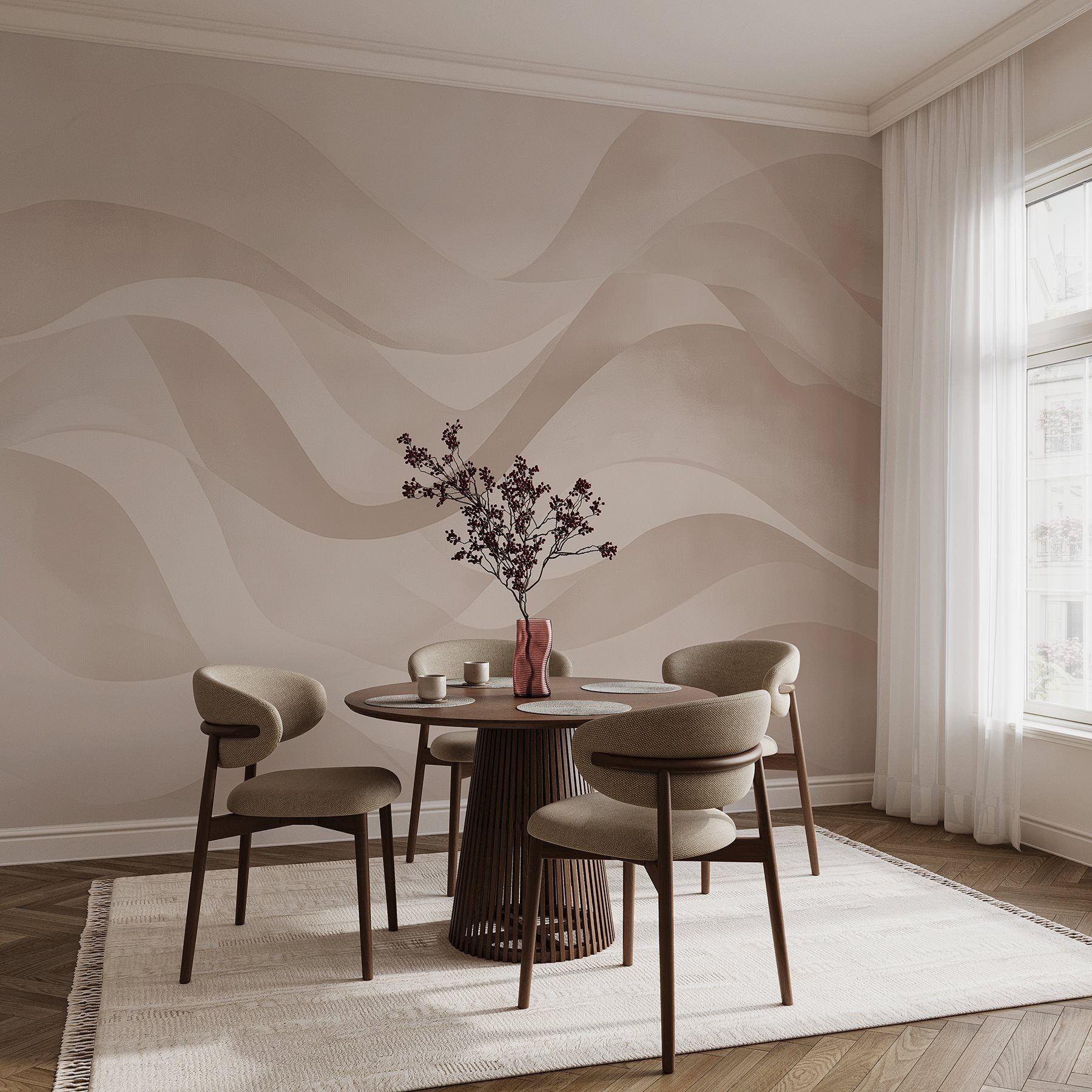 Képzelje el, hogy belép egy olyan szobába, ahol a falak nyugalmat sugároznak. Ez a falfestmény lágy fehér és rózsaszín hullámokkal olyan, mint egy lágy szellő egy vasárnap reggelen. A nyugtató árnyalatok nyugodt hátteret teremtenek, amely tökéletes a hosszú nap utáni pihenéshez vagy a barátokkal való beszélgetésekhez. Hát nem tudod elképzelni? Talán egy kényelmes székkel és egy csésze gőzölgő teával a közelben, vagy talán egy kis galéria bekeretezett emlékekkel, amelyek az élet legszebb pillanatait mutatják be. Ez a falfestmény nem csak díszít; egyfajta nyugalmat áraszt, amely meleg ölelésként ölel körbe. Ideális bármilyen térbe, amely egy csipetnyi eleganciára vágyik, és a hétköznapi falakat álomszerű meneküléssé varázsolja. Tökéletes azokban a pillanatokban, amikor emlékeztetőre van szükséged, hogy lélegezz és élvezd az élet apró örömeit!