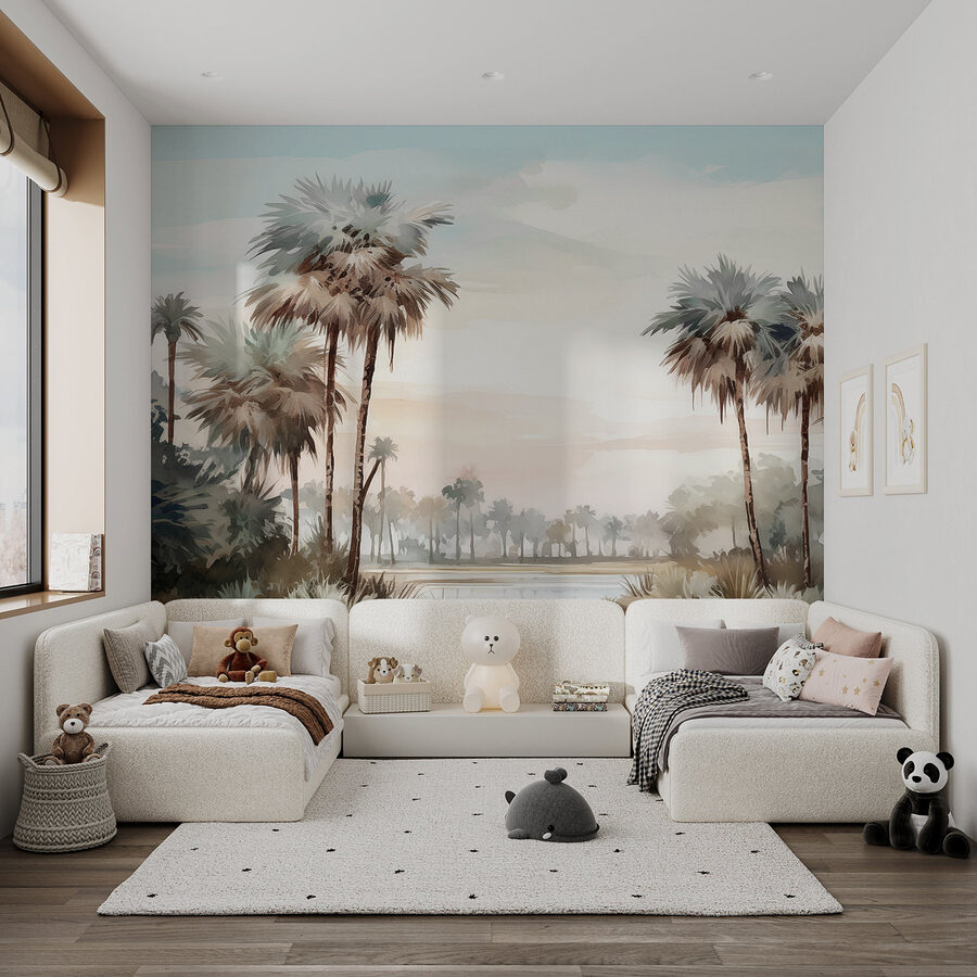Alakítsa át terét ezzel a varázslatos falfestménnyel, a “Víz és pálmafák egy folyó mellett” cíművel. Képzelje el, hogy egy olyan szobába lép be, ahol buja pálmafák lágyan ringatóznak egy nyugodt folyó felett, és egy darabka paradicsomot hoz az otthonába. A lágy színek és a finom vonások békés hangulatot teremtenek – tökéletesen alkalmas az álmodozáshoz vagy csak egy kávé szürcsöléséhez, miközben úgy teszel, mintha egy tengerparti kiránduláson lennél.