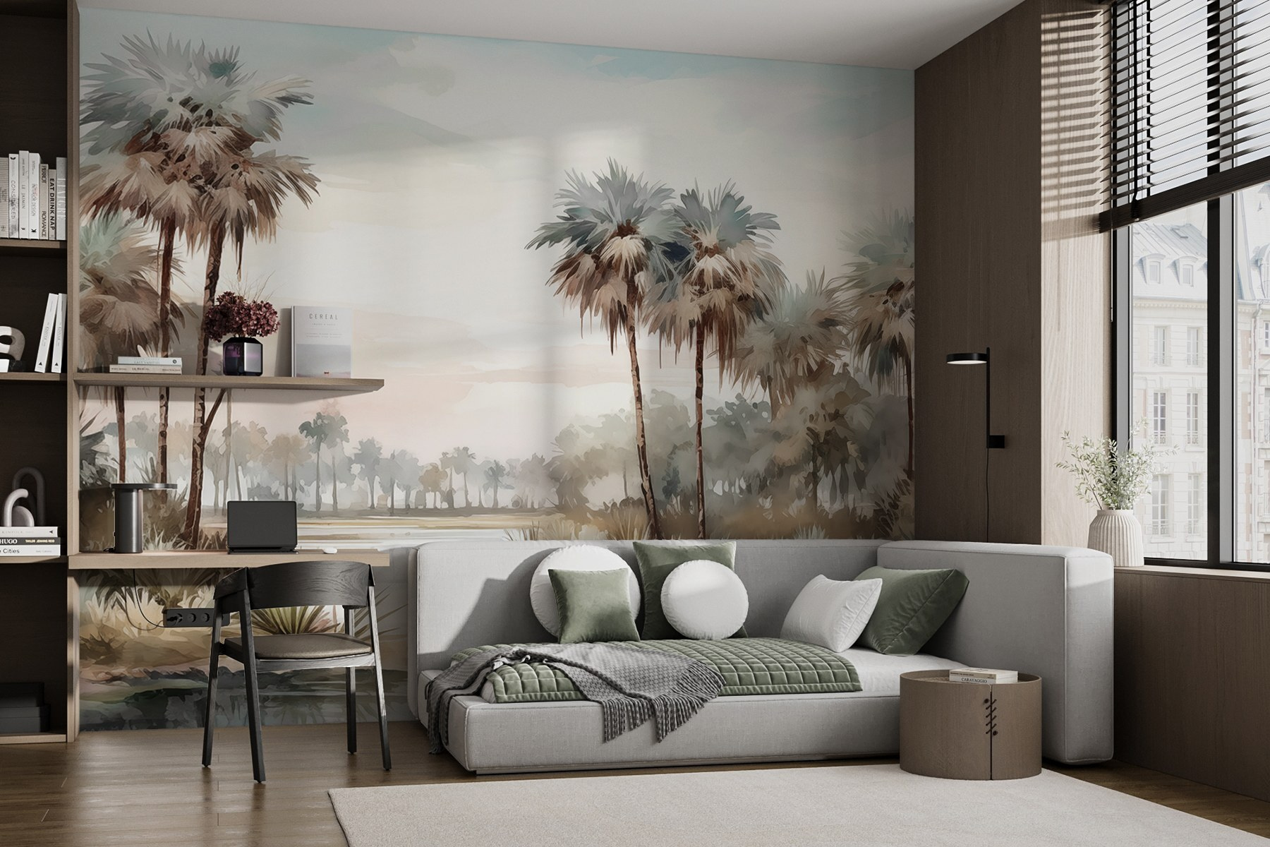 Alakítsa át terét ezzel a varázslatos falfestménnyel, a “Víz és pálmafák egy folyó mellett” cíművel. Képzelje el, hogy egy olyan szobába lép be, ahol buja pálmafák lágyan ringatóznak egy nyugodt folyó felett, és egy darabka paradicsomot hoz az otthonába. A lágy színek és a finom vonások békés hangulatot teremtenek – tökéletesen alkalmas az álmodozáshoz vagy csak egy kávé szürcsöléséhez, miközben úgy teszel, mintha egy tengerparti kiránduláson lennél.