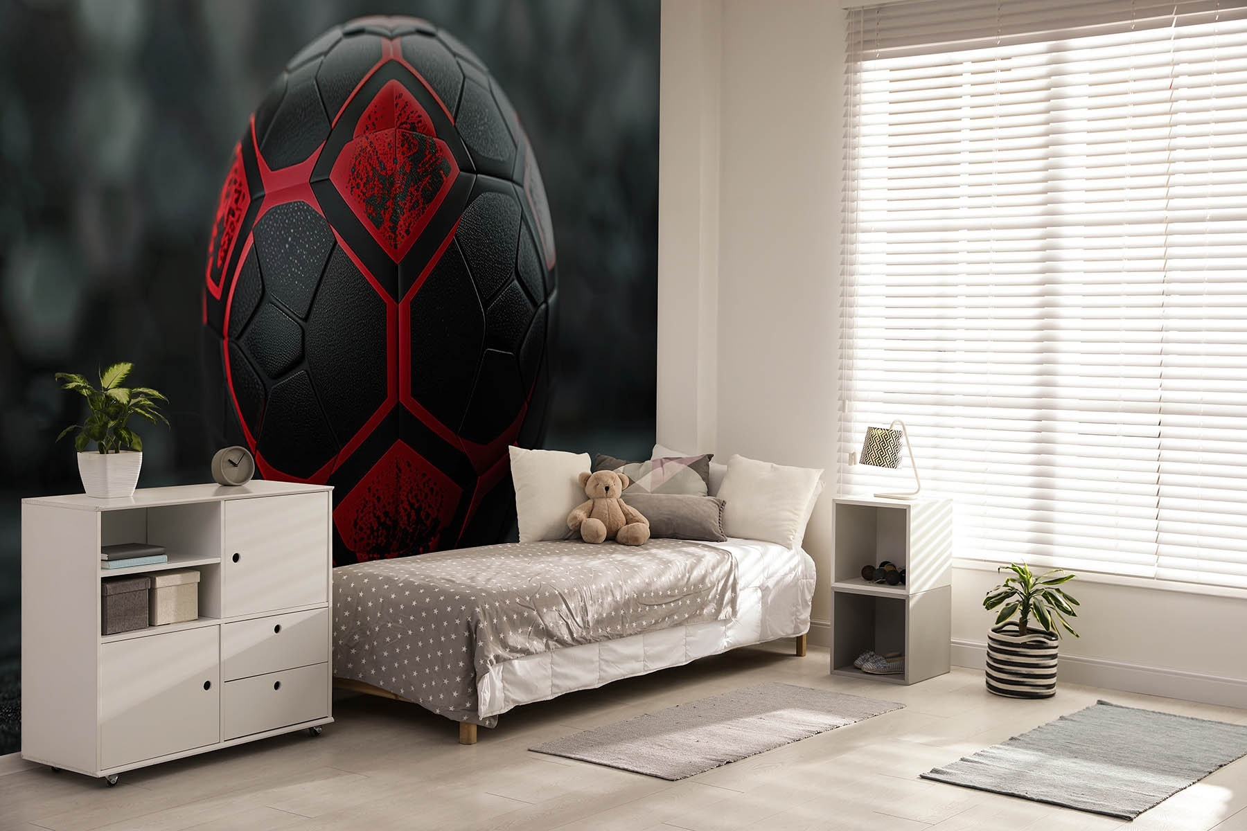 Merülj el egy olyan világban, ahol a falak a végső szurkolói zónává válnak ezzel a fekete-piros focilabdát ábrázoló, feltűnő falfestménnyel. Olyan, mintha egy mini stadiont hoznál a lakótérbe – persze a zsúfolt lelátók és a hot dogok nélkül. Ez a falfestmény nem csupán dekoráció; ez egy meghívás arra, hogy újra átéld a meccsek izgalmas pillanatait, közvetlenül a kanapédról. Képzelje el: a barátok összegyűlnek, a rágcsálnivalók repkednek, és valaki drámai módon eljátssza az utolsó pillanatban szerzett gólt. Élénk, merész, és tökéletesen tudja, hogyan kell ellopni a show-t. Tökéletes hálószobákba, játszószobákba, vagy bárhová, ahol szükség van egy csipetnyi izgalomra és a gyönyörű játékra. Akár alkalmi néző vagy, akár megrögzött szurkoló, ez a falfestmény minden alkalommal beszélgetést és mosolyt vált ki, amikor valaki elsétál mellette.