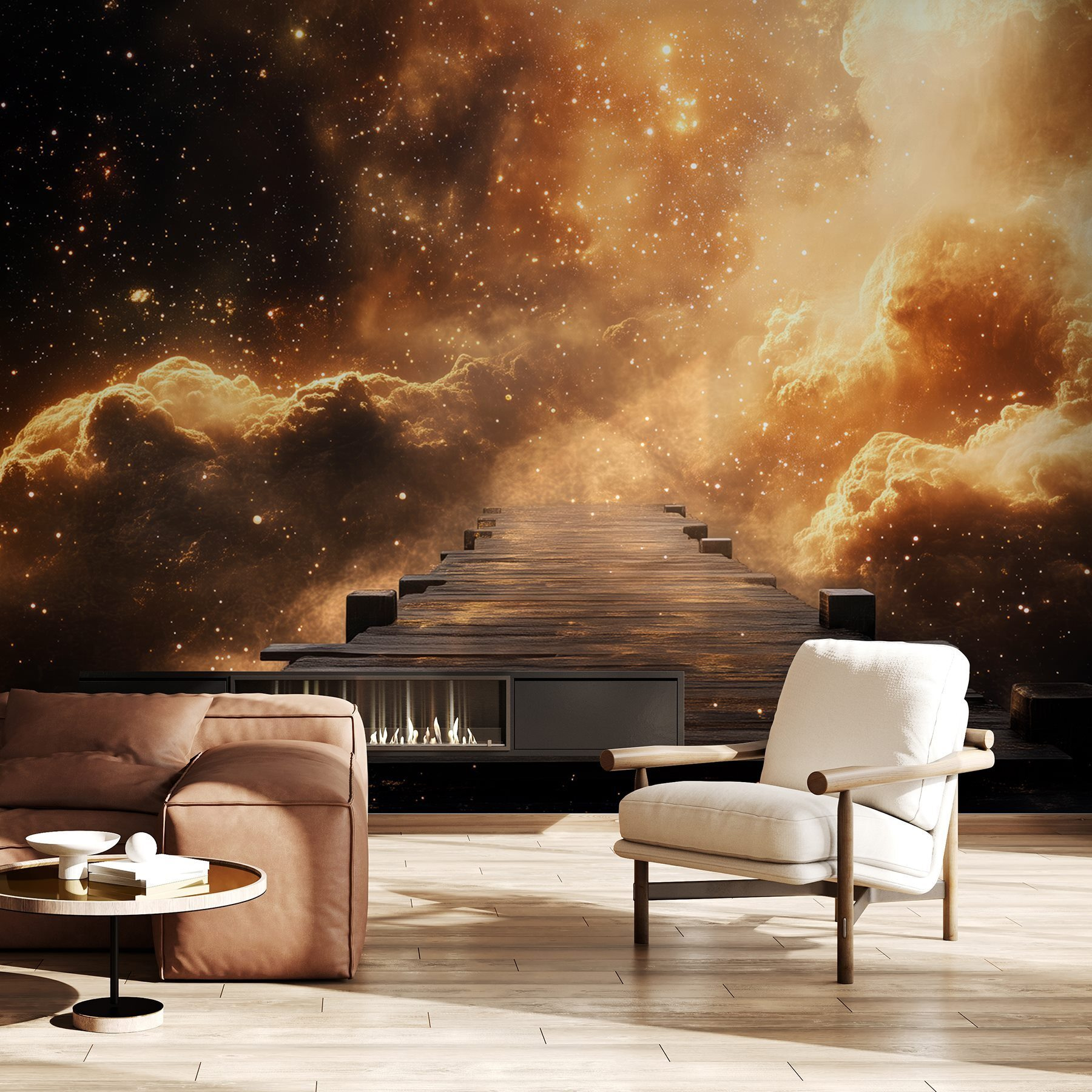 Alakítsd át a teredet a „Felhőkhöz vezető fa híd” faliképpel. Képzeld el, hogy egy kopott fa hídra lépsz, amely mintha egy álomszerű galaxisba vezetne. Ez kalandvágyat ébreszt, olyan érzést kelt, hogy „vajon hova fogok jutni?”. Az élénk színek meleg és hideg tónusokat ötvöznek, varázslatos hátteret teremtve, amely felébreszti a képzeletet. Képzelje el azokat a csendes reggeleket, amikor kávét kortyolgatva a csillagokkal és felhőkkel tarkított eget bámulja – tiszta boldogság. Tökéletes a kreativitás felébresztéséhez vagy egyszerűen csak álmodozáshoz. Ez a falikép könnyed eleganciával rendelkezik, és egy kis fantasztikumot csempész az otthonába. Ki ne szeretne néha elmenekülni a felhők közé?
