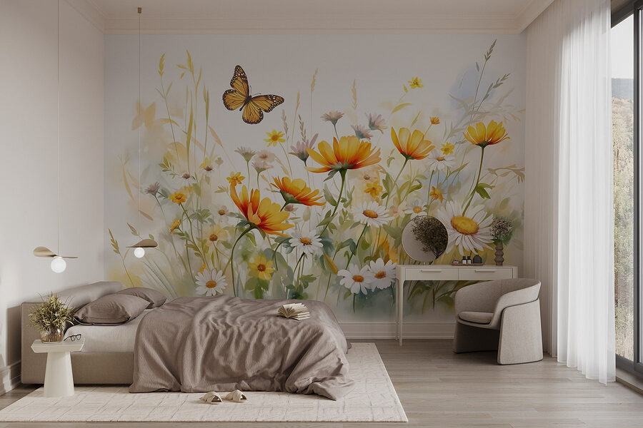 Változtassa át terét vibráló kertté ezzel a lenyűgöző falfestménnyel, amelyen egy pillangó repked egy virágmező felett. Játékos természetet varázsol, amely bármely helyiséget frissé és hívogatóvá varázsol. Képzelje el, ahogy kávét kortyolgatva sütkérezik ebben a vidám jelenetben – olyan, mintha egy kis tavasz lenne a falán, csak a pollenfájás nélkül. A kirobbanó színek feldobhatják a hangulatodat, és inspirálhatják a körülötted lévőket. Tökéletes háttere lehet egy hangulatos olvasósaroknak vagy egy élénk játszószobának. Ki ne szeretne elmerülni ebben a virágos fantáziában?