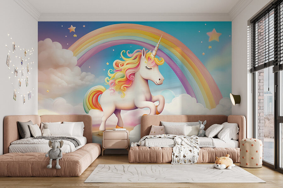 Varázsoljon bármelyik szobát mesés csodaországgá ezzel a varázslatos faliképpel, amelyen egy vidám egyszarvú ugrál a felhők között egy ragyogó szivárvány alatt! Olyan, mint egy soha véget nem érő játékos álom, amely tökéletesen ösztönzi a fantáziát. A gyerekek (és legyünk őszinték, a felnőttek is) imádni fogják a varázslatos hangulatot. Képzelje el a nevetéssel teli mesedélutánokat, vagy egy hangulatos teret, ahol a kreativitás szabadon áramlik. A tapéta lágy színei gyönyörű hátteret alkotnak – megnyugtatóak, mégis izgalmasak, így ideálisak játszószobákba vagy gyerekszobákba. Ki ne szeretne minden reggel egy kis varázslattal ébredni?