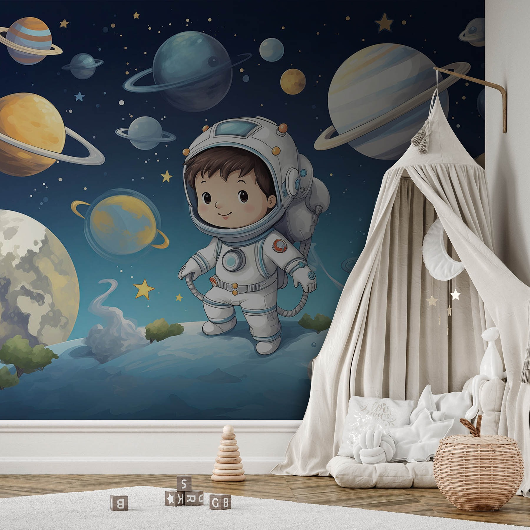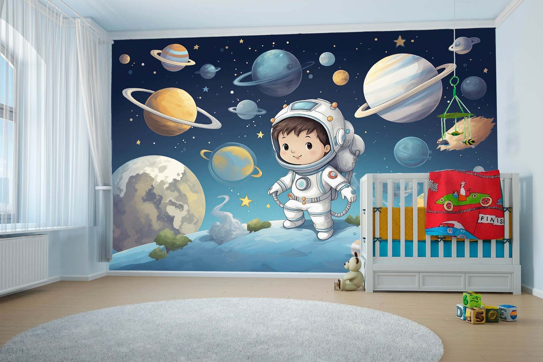 Indulj el a kalandok felé ezzel a kedves faliképpel, amelyen egy imádnivaló kisfiú űrhajósruhában látható! Képzeld el: egy szoba, amely kozmikus játszótérré alakul, ahol a képzelet magasabbra szárnyalhat, mint a Szaturnusz gyűrűi. Az élénk színek a galaxis varázslatos szépségét tükrözik. A kicsik nagy álmokat álmodhatnak, miközben a kíváncsiságot és örömöt keltő bolygók és csillagok között lebegnek! Akár gyermekszobába, akár játszószobába kerül, ez a tapéta fantáziadús és kozmikus varázslatot kölcsönöz a helyiségnek. Ki ne szeretne meteorokat üldözni, miközben nasit eszik? Mintha egy mini űrhajós állna készen a csillagközi kalandra a falon!