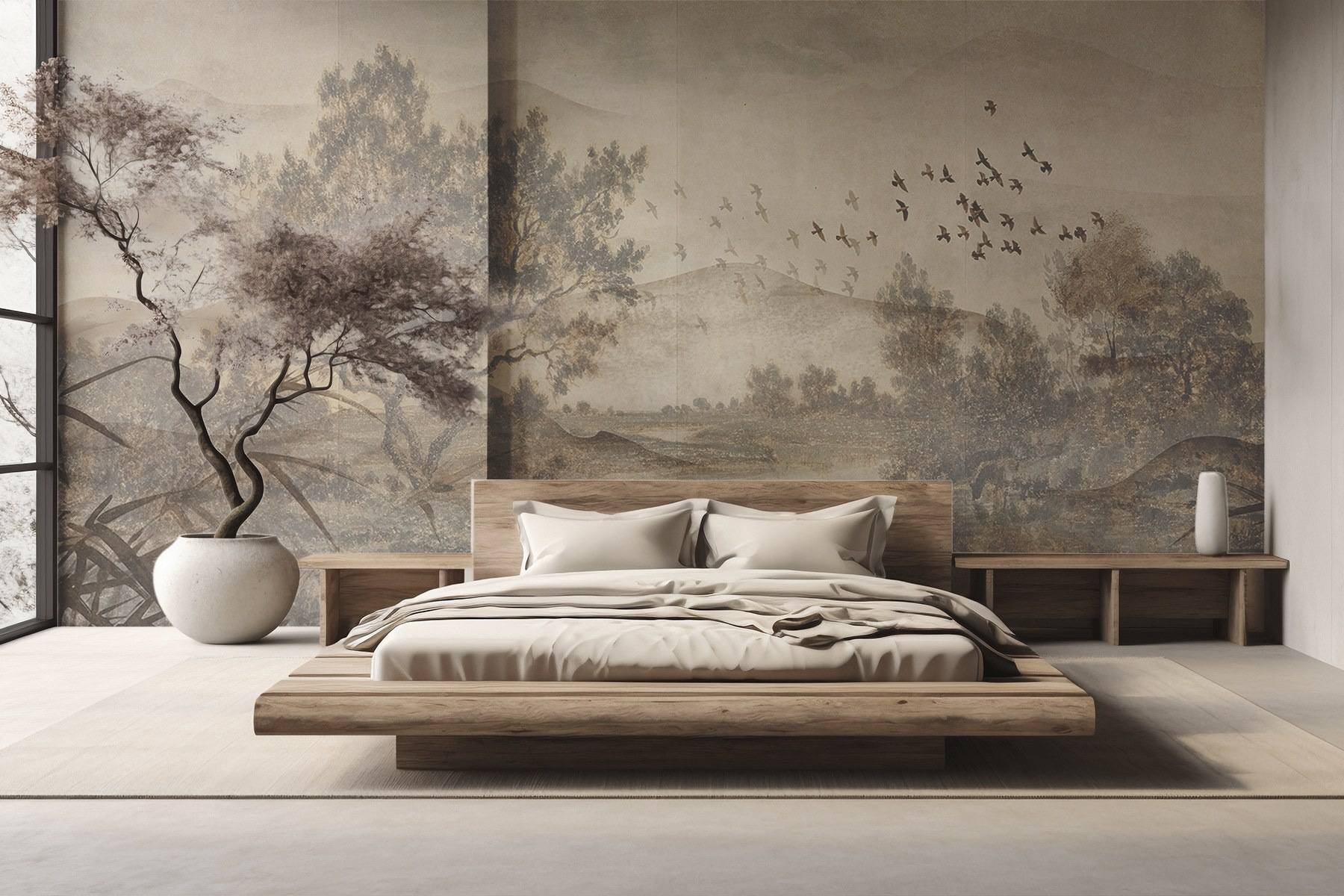 Alakítson át bármilyen helyiséget nyugodt meneküléssé ezzel a lenyűgöző falfestménnyel, amely egy nyugodt, fákból és egy szelíd folyóból álló tájat ábrázol. Képzelje el, hogy a természet lágy árnyalataira ébred – mintha a természet egy darabját hozná be a házába. Az akvarell stílus álomszerűvé teszi a képet, amely tökéletesen megnyugtatja az elmét egy hosszú nap után. Képzelje el, hogy kávét kortyolgatva bámulja a játékos madarakat, vagy tökéletes hátteret biztosít egy hangulatos olvasósarok számára. Ez a falfestmény békés pillanatokról és lusta délutánokról suttog. Ez nem csak művészet; ez egy élmény, amely arra vár, hogy feldobja a terét.