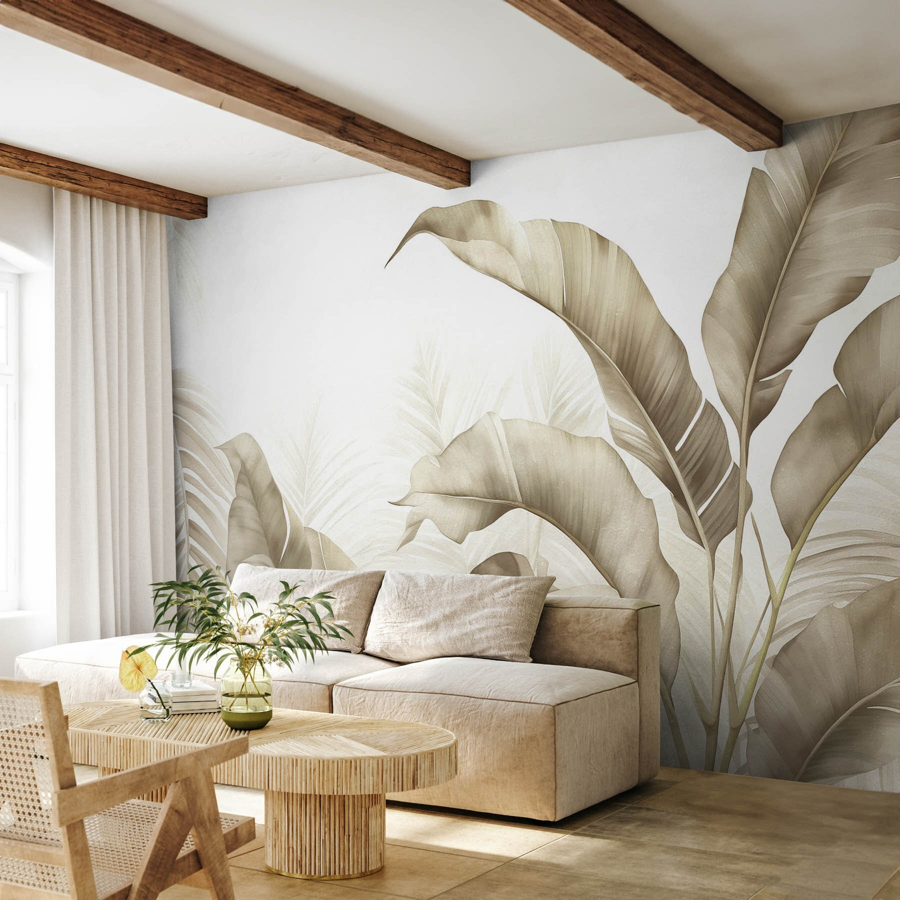 Dobja fel terét ezzel a lenyűgöző falfestménnyel, amely természetes tónusok és elegáns lombok gyönyörű mintázatát mutatja be. Képzelje el, hogy belép egy olyan szobába, ahol a lágy zöldek és a gyengéd barnák meghitt ölelésbe burkolják Önt, szinte mintha a természet meleg ölelése lenne. Tökéletes azokhoz a napokhoz, amikor egy trópusi kiruccanásról álmodozol, anélkül, hogy elhagynád az otthonodat. A levelek zökkenőmentes keveredése egy csipetnyi kifinomultságot kölcsönöz, így még a legkisebb területet is buja oázisnak érzi. Egy unalmas falat alakítson át beszélgetésindítóvá – a vendégek nem fogják megállni, hogy ne csodálják meg. Művészet? A természet? Talán mindkettő!