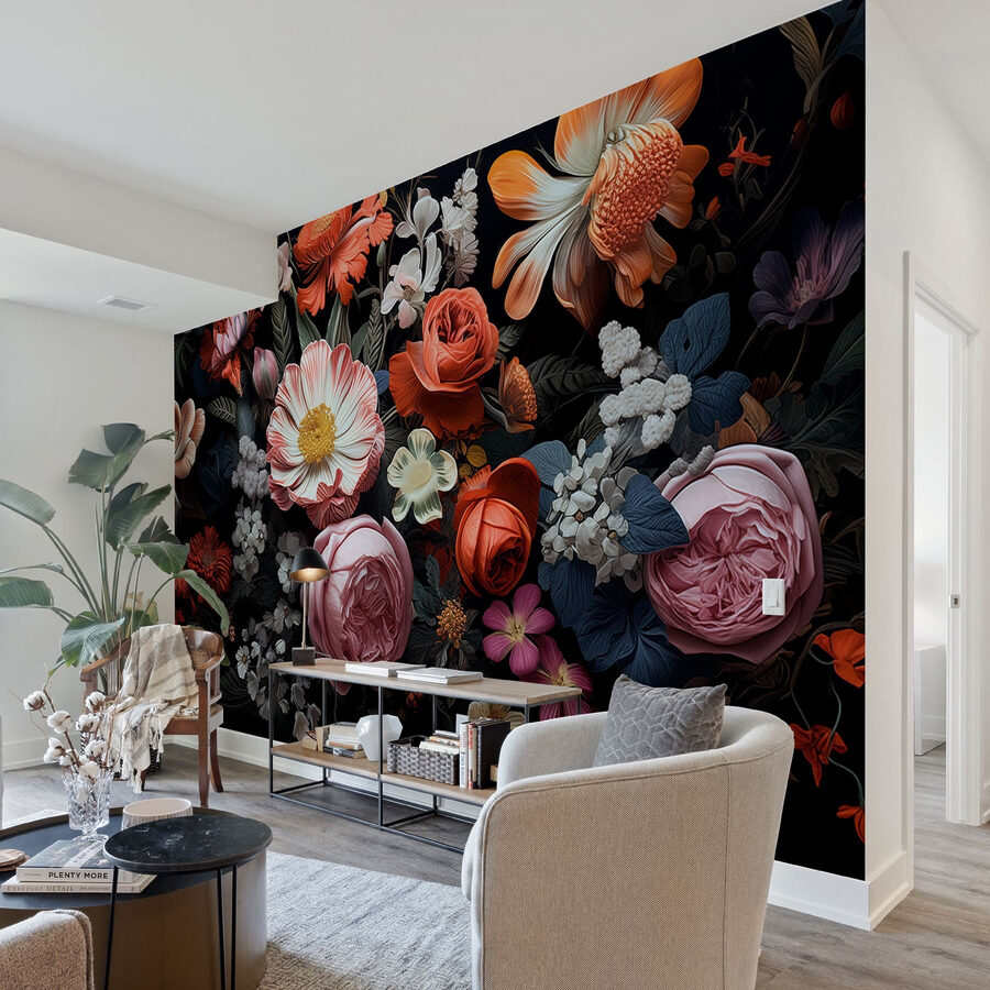Alakítsa át terét ezzel a lenyűgöző falfestménnyel, amely egy élénk virágcsoportot ábrázol merész fekete háttér előtt. Képzelje el, hogy belép egy olyan helyiségbe, ahol a természet szépsége látszólag kitör a falakból. Minden egyes virágnak megvan a maga története, a vibráló szirmok egy virágzó kert titkait suttogják. Ez a falfestmény melegséget és életet varázsol bármely területre – tökéletes egy hangulatos nappaliba vagy egy elegáns irodába. A vendégek talán azon kapják magukat, hogy bámulva kérdezgetik, hol van a kert. Mi lehet jobb, mint egy kis virágos inspiráció, ami örömet okoz?