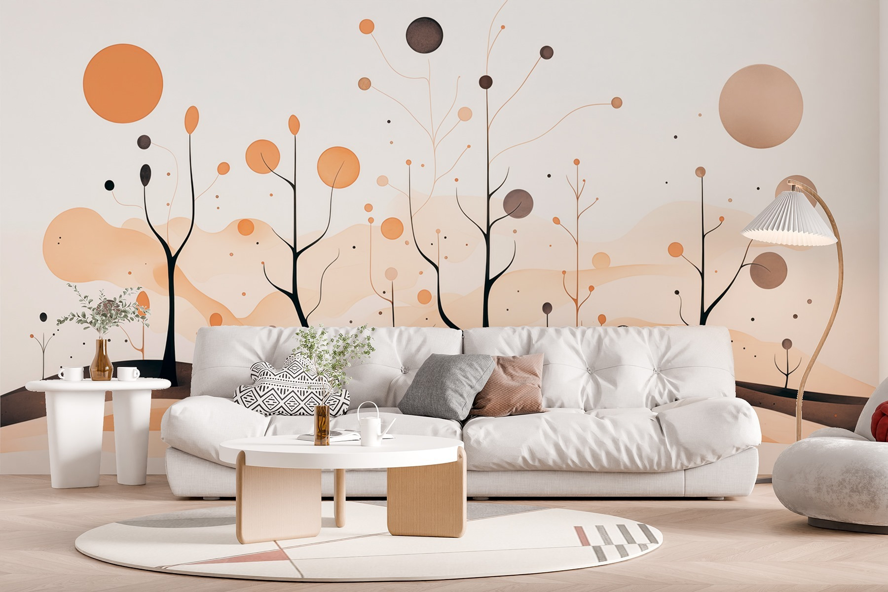 Bármilyen teret alakítson át nyugodt pihenőhellyé ezzel a szeszélyes falakat és szelíd, áramló formákat ábrázoló, magával ragadó falfestménnyel. Képzelje el, hogy minden alkalommal, amikor belép a szobába, egy álomszép tájba lép. A lágy narancs és a földes barna meleg színei hangulatos hangulatot teremtenek, amely tökéletes a kreativitás inspirálására vagy egy hosszú nap utáni kikapcsolódásra.